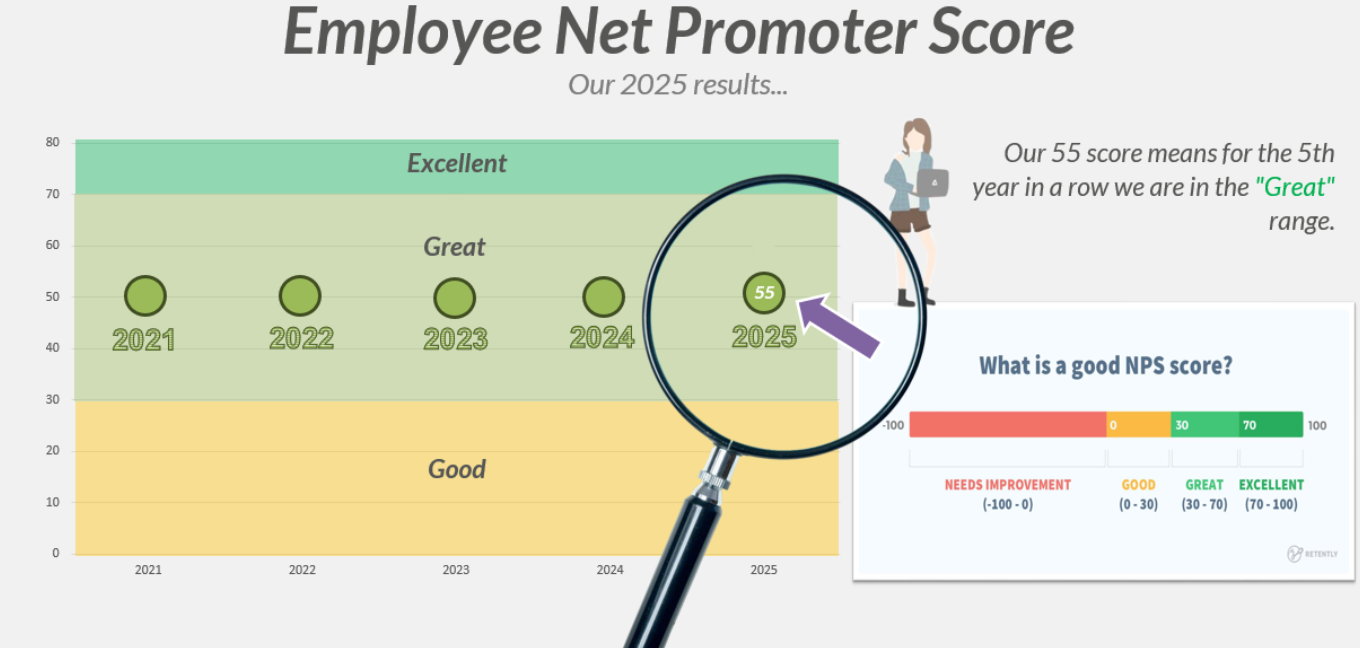 We're proud to share that our Employee Net Promoter Score for 2025 (eNPS) is 55, keeping us in the ‘Great’ range for 5 years running and is a strong reflection of the trust, engagement, and satisfaction our team feels working here. It's a testament to the culture we've built together.